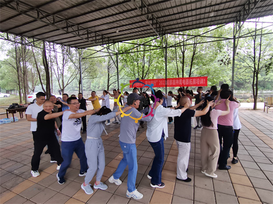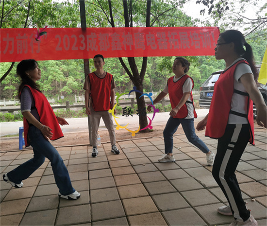 热身完毕后,活动正式进入高潮;首项挑战为“齐心协力”,这是一个深度考验团队协作与沟通能力的游戏,队员们双手搭肩一步一步,通过智慧与力量的交融,共同跨越难关,生动诠释了鑫神鹰电器团结一致,同舟共济的企业精神。