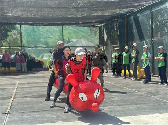 五彩斑斓的“毛毛虫”道具一登场,便引来阵阵欢呼;每队八人骑跨在充气毛毛虫上,需保持步伐一致,快速冲向终点。一声哨响,各队“毛毛虫”左右摇摆、奋力前行,队友们高喊口号、步调一致,场面既紧张又滑稽;最终“飞跃队”凭借出色的节奏掌控率先冲线,赢得首场胜利。